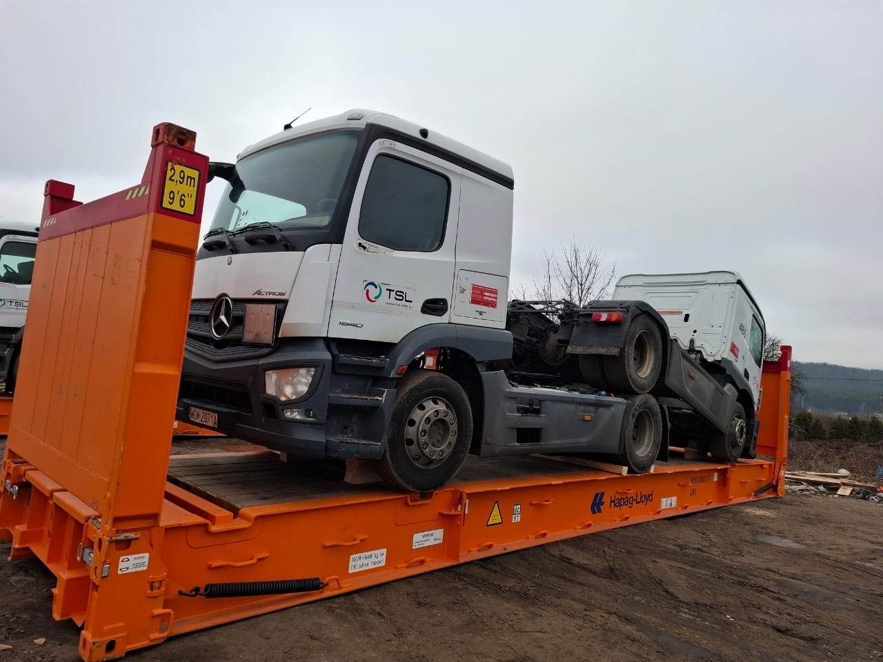 Zrealizowaliśmy projekt formowania dwóch kontenerów typu Flat Rack, przeznaczonych do transportu ponadgabarytowych pojazdów. Na każdy z kontenerów załadowaliśmy po dwie ciężarówki, odpowiednio zabezpieczając je zgodnie z wymogami międzynarodowego transportu morskiego.