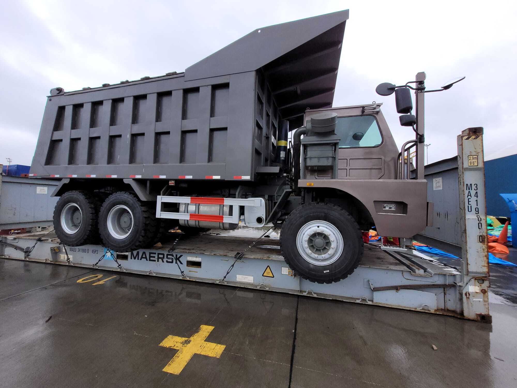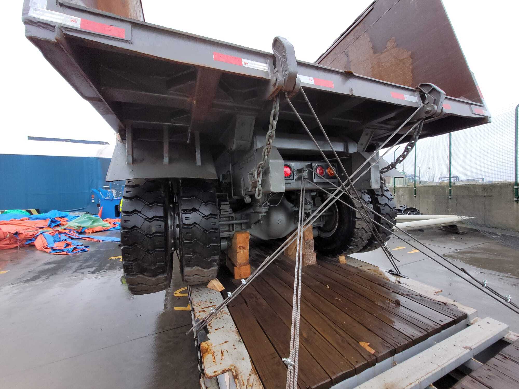 Zrealizowaliśmy rozformowanie kontenera typu Flat Rack, w którym znajdowała się wywrotka przygotowana do transportu. Po zdjęciu zabezpieczeń i ostrożnym rozładunku pojazd został profesjonalnie przeładowany na specjalistyczną ciężarówkę przystosowaną do przewozu ładunków ponadgabarytowych.